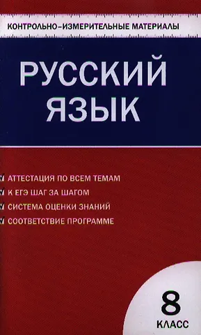 Содержащиеся в пособии контрольно-измерительные материалы (КИМы) для 8 класса, аналогичные материалам ЕГЭ, составлены в соответствии с программой общеобразовательных учреждений по русскому языку и учитывают возрастные особенности учащихся. В конце пособия даны ответы на все варианты тестов, предложены диктанты и изложения различных типов, индивидуальные задания.