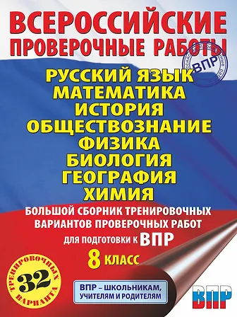 Пособие содержит 32 тренировочных варианта проверочных работ по РУССКОМУ ЯЗЫКУ, МАТЕМАТИКЕ, ИСТОРИИ, ОБЩЕСТВОЗНАНИЮ, ФИЗИКЕ, БИОЛОГИИ, ГЕОГРАФИИ И ХИМИИ — предметам, по которым пишут ВПР в 8 классе на всей территории страны. Содержание проверочных работ соответствует Федеральному государственному образовательному стандарту основного общего образования. Каждый вариант составлен в полном соответст