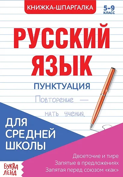 Книжка-шпаргалка по русскому языку подходит для учащихся средней школы. Пособие содержит правила пунктуации, поясняет использование двоеточия и тире, а также употребление запятых в предложениях и перед союзом «как».