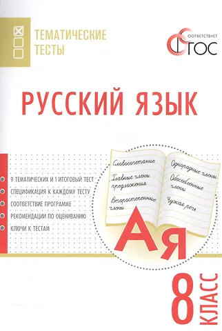 В пособии представлены девять тематических тестов и один итоговый в двух равнозначных вариантах. Каждый тест имеет спецификацию, где указаны проверяемые элементы содержания, виды знаний и умений, контролируемые данным тестом, уровень усвоения материала и др. Подробная информация о том, как работать с тематическими тестами, изложена в пояснительной записке. В конце издания ко всем тестам даны ответы. Пособие составлено в соответствии с требованиями ФГОС основного общего образования. Издание адресовано учителям русского языка средней школы и может использоваться для тематического контроля с целью мониторинга эффективности учебного процесса.