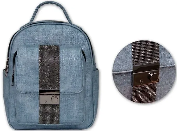Рюкзак арт.46663 СЕРО-ГОЛУБОЙ (без наполнения, 35х26х12, одно отделение, искусственная кожа, клапан с застёжкой "замок", лямки, регулируемые по длине, молния, четыре кармана, декорирован лентой из страз, ПЭТ-пакет)
