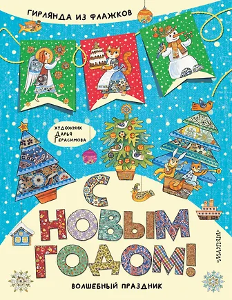 Яркую и такую праздничную гирлянду из флажков с волшебными рисунками Дарьи Герасимовой очень просто сделать самим. Вам понадобятся только ножницы, клей, веревка и совсем немного времени, чтобы вместе с ребенком создать в комнате настоящую праздничную атмосферу. Их можно повесить не только на ёлку, но и на стену, на дверь, украсить шкафы!