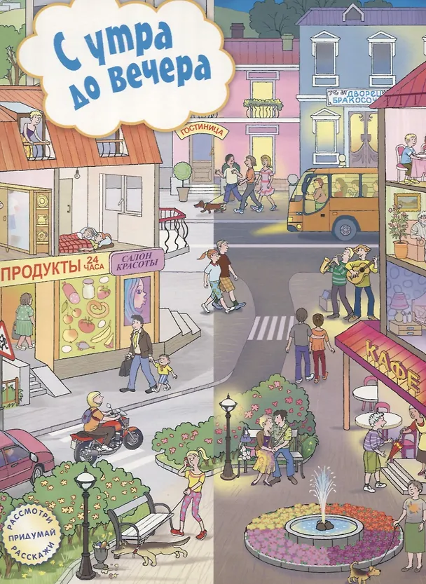 Эта книга нарисована от начала до конца. Большие, тщательно прорисованные картинки можно рассматривать часами, замечая все новые и новые детали и сюжеты и разгадывая истории, которые происходят с персонажами книги. А еще можно фантазировать, придумывая свои истории. Ребенок, рассматривая ее вместе со взрослыми, расширяет свой словарный запас и улучшает память.