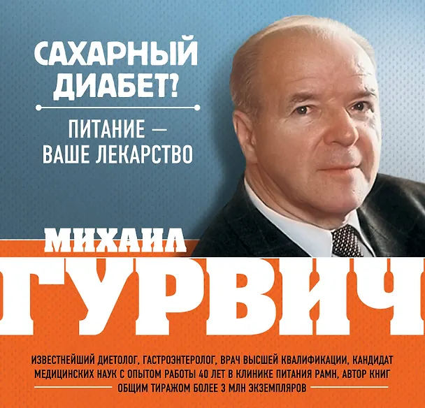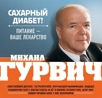 Правильное питание - это самое главное для тех у кого диабет или есть предрасположенность к нему. Автор Михаил Гурвич, ведущий диетолог России, не скрывает, что сам является диабетиком со стажем. Поэтому его советы не только высокопрофессиональные, но легко исполнимы, вкусны и многократно проверены на практике. Рецепты вкусных блюд со сбалансированным составом помогут вам чувствовать себя здоровым человеком. В книге как выбрать диетические продукты таблицы замены продуктов на основе хлебных единиц более 100 рецептов из круп, яиц, творога, мяса, рыбы и молока