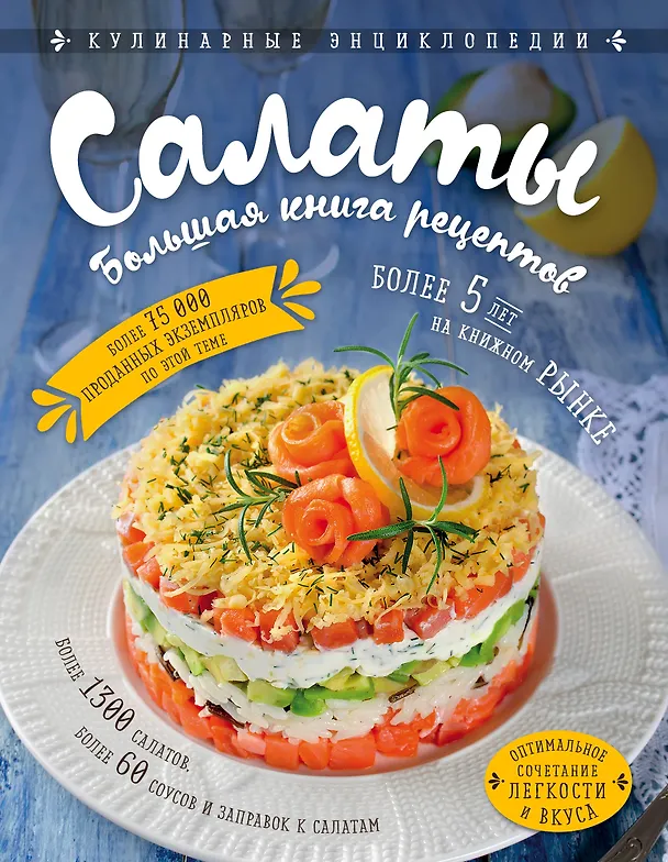 Читала в инете разные отзывы об этой книге салатов, все же решила заказать и тоже не пожалела! Все хорошие рецепты, о которых я слышала, здесь есть. Я решила сравнить ингредиенты в рецептах книги с их наличием в разных источниках интернета. Все сходится, за исключением мелочей в некоторых салатах, например, жареного лука, что предлагают рецепты интернета. В книге рецепты более классические, без него, что меня никак не расстраивает. В книге такое количество рецептов, что переделать даже половину нереально. Есть салаты очень специфические в сочетании ингредиентов, но , опять же, мы все разные и не можем отдавать предпочтение только "Оливье". Большой раздел Праздничных салатов. Ощущение, что собрали все салаты с мелких сборников