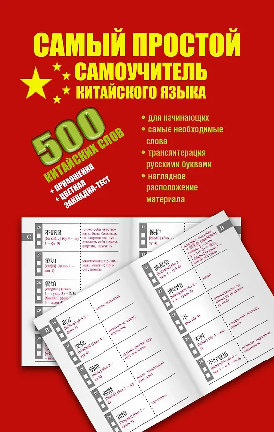 Этот учебный словарь содержит 500 наиболее употребительных слов современного китайского языка, вполне достаточных для чтения и перевода несложных текстов и для выполнения практических заданий. С помощью специальной цветной закладки вы сможете закрепить пройденный материал и проверить свои знания.Кроме того, книга включает 200 предложений на китайском языке, мужские и женские русские имена и наименования субъектов Российской Федерации и их центральных городов на китайском языке.Предназначен для всех, кто интересуется китайским языком и начинает изучать его в школе, на курсах или самостоятельно.