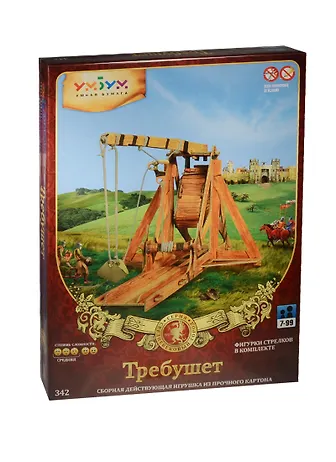 Сборная ДЕЙСТВУЮЩАЯ модель Требушет. В комплекте набора листы с предварительно вырубленными элементами модели, инструкция и схема сборки. Сборка модели происходит без использования ножниц и клея. Состав набора: требушет, метательные ядра, фигурки на подставках -6 штук. Все сборные модели «Умная Бумага» разрабатываются на основе чертежей. В их оформлении широко используются современные способы обработки бумаги для передачи рельефности поверхности. Рекомендации по сборке: аккуратно отделите элемент от листа и соедините с последующим, как указано на схеме. Соединение происходит за счет вставки язычка клапана в прорезь, согласно схеме. При необходимости раздвиньте края прорези заостренным концом