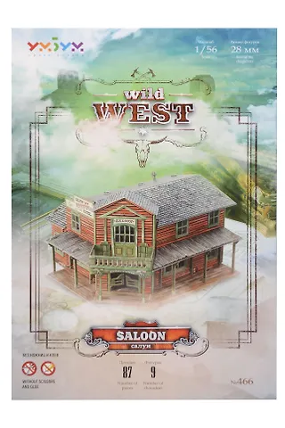 Сборная модель из картона «Салун» (серия «Дикий Запад», артикул 466) — это 3D-пазл, который позволяет собрать миниатюрный салун в стиле Дикого Запада. Модель выполнена из прочного картона и не требует использования клея или ножниц — детали уже вырезаны, их нужно только соединить между собой. Масштаб 1/56. Размер фигурок 28 мм.