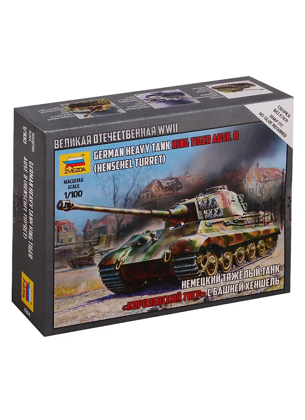 Немецкий тяжёлый танк Tiger II, прозванный королевским тигром - оплот, созданный в агонии Третьего Рейха. Сборная модель тигоря с башней Хеншель (я никогда не видел в продаже вариацию с башней Порше от Звезды) в масштабе 1:100. Не смотря на свой размер, модель имеет хорошую детализацию. Достойное качество самих деталей танка. Собирается легко и просто, даже без клея, хотя он желателен