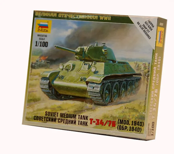 Сборная модель "Советский средний танк Т-34/76" в масштабе 1/100 от компании Звезда - первая собранная мною модель. Пожалуй одна из самых подходящих моделей в 100-ом масштабе для новичков. С ней справятся как взрослые, так и дети. Очень простая в сборке. Состоит всего из 5 деталей. На коробке указано "сборка без клея", но всё же лучше использовать его в небольшом количестве для надёжного скрепления деталей. Также понадобятся краски 4 -5 цветов