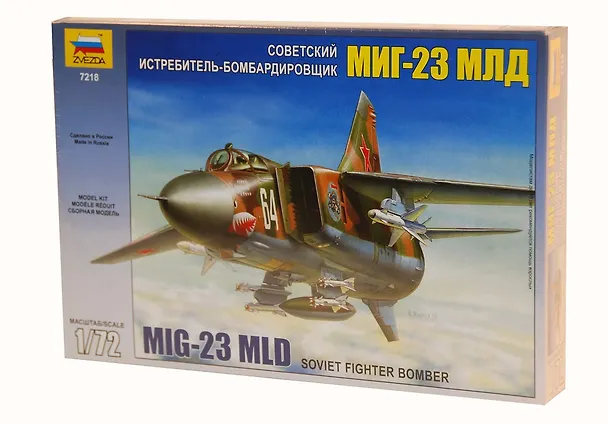 .Набор деталей для сборки модели советского истребителя-бомбардировщика МИГ-23 МЛД. Набор собирается при помощи специального клея, выпускаемого предприятием "Звезда". Клей и краски продаются отдельно от набора.
