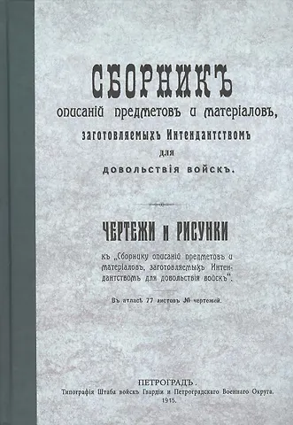 Как выглядела русская армия накануне и в первый год Великой войны (так современники именовали Первую мировую войну) ? Этой теме посвящено множество публикаций, авторы которых опираются на различные источники. Есть, однако, источник, который следует признать фундаментальным и мимо которого не может пройти ни один любитель отечественной военной старины. Речь идет о той самой книге, которую вы сейчас держите в руках — «Сборнике описаний предметов и материалов, заготовляемых интендантством для довольствия войск», изданном в 1915 году в Петрограде по инициативе Главного интендантского управления русской армии. Перед Первой мировой войной сборники подобного рода публиковались несколько раз. «Сборн