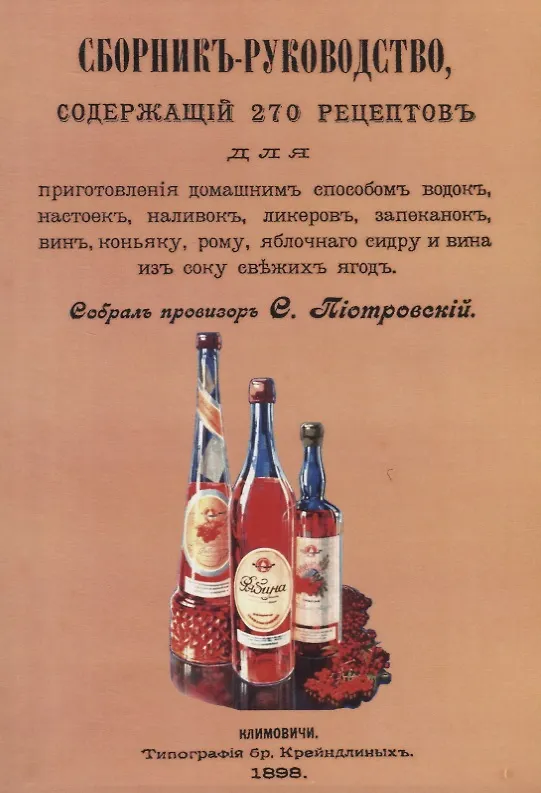 Сборник-руководство, содержащий 270 рецептов для приготовления домашним способом водок, настоек, наливок, ликеров, запеканок, вин, коньяку, рому, яблочного сидру и вина из сока свежих ягод
