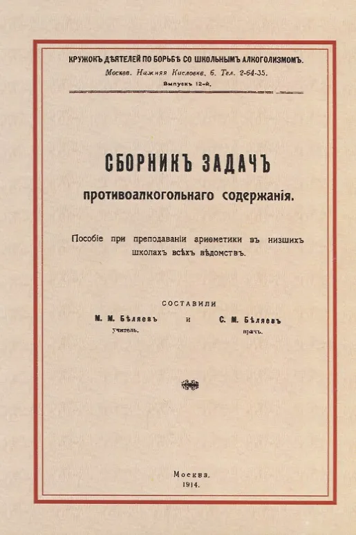 Москва, 1914 год. Смешные (сегодня) задачи. Пособие при преподавании арифметики в низших школах всех ведомств. Кружок деятелей по борьбе со школьным алкоголизмом. Составили М. М. Беляев (учитель) и С. М. Беляев (врач). Книга изготовлена по технологии "печать по требованию".Тираж: 30 экземпляров.