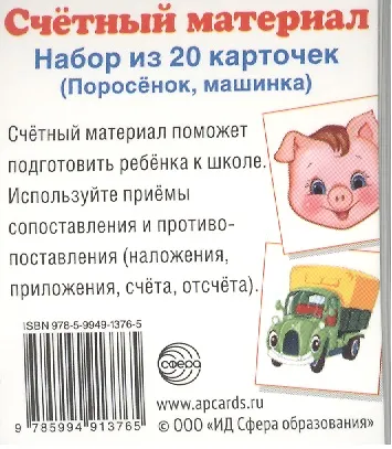 Счетный материал. Набор из 20 карточек. Поросенок, машинка