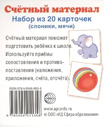 Счетный материал. Набор из 20 карточек. Слоники, мячи.