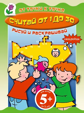Эта полезная раскраска подарит малышу возможность не только тренировать руку, но и изучать счёт. Ведь чтобы узнать, какой рисунок раскрашивать, юному художнику придётся соединить точки по порядку от 1 до 30. А яркие наклейки сделают занятия намного веселее и интереснее!