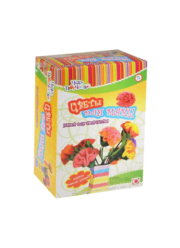 Набор сделай букет своими руками. В наборе: детали из фетра, лента, детали для вазы из картона, проволока, нитки, клейкая зеленая лента. Подробная инструкция на обороте коробки.