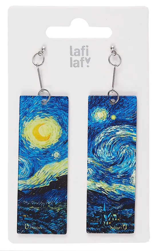 Изначально резервировали для покупки другие серьги с веткой миндаля, но в итоге выбрала эти серьги, так как брала в подарок подруге, большой поклоннице творчества Ван Гога, и исходила из её внешних данных. Серьги очень классные, строгая прямоугольная форма придаёт им шарм, а изображение - элегантности. Серьги представляют собой пусеты с резиновыми затычками, комплектность в порядке. Очень лёгкие, что обеспечивает комфортность при носке.