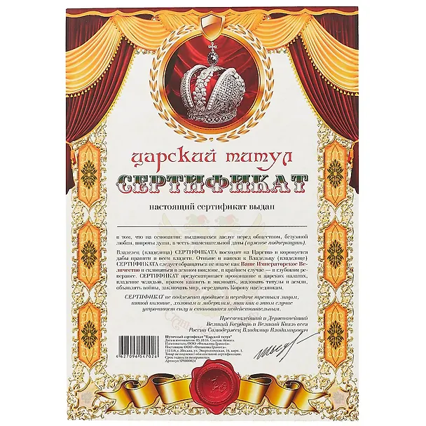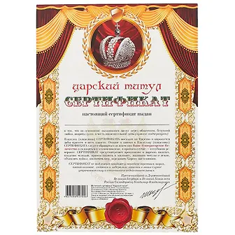 Забавный сертификат станет прекрасным дополнением к подарку и поводом ещё раз поздравить коллегу, члена семьи или дорогого друга. Сделайте важный вид и с очень серьёзным лицом вручите сертификат на царский титул – это весело и забавно.