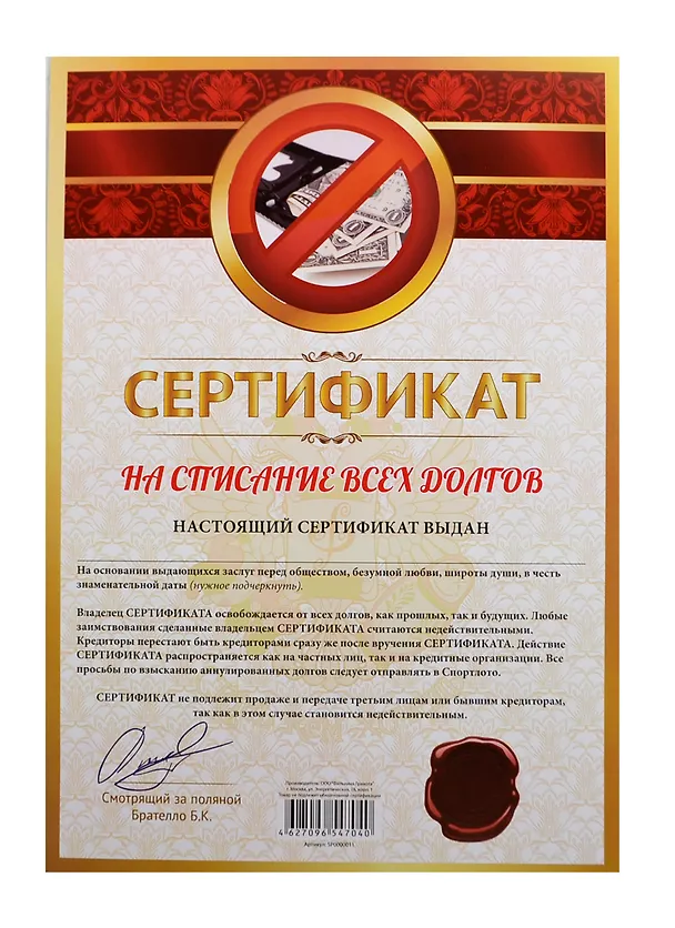 Сертификат на списание всех долгов (SP0000011) (Мастер)