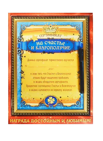 Сертификат в рамке с маркером На счастье и благополучие (23,1х30,6) (749592) (Сима-ленд)