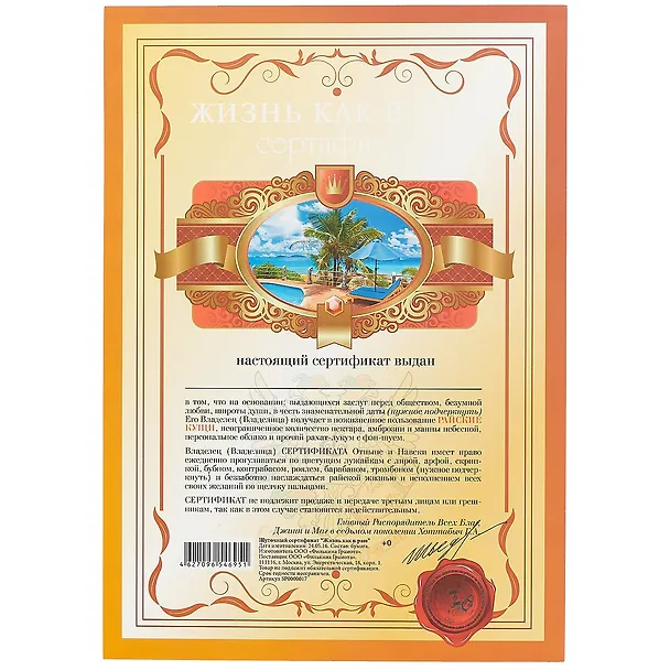 Сертификат «Жизнь как в раю», А4