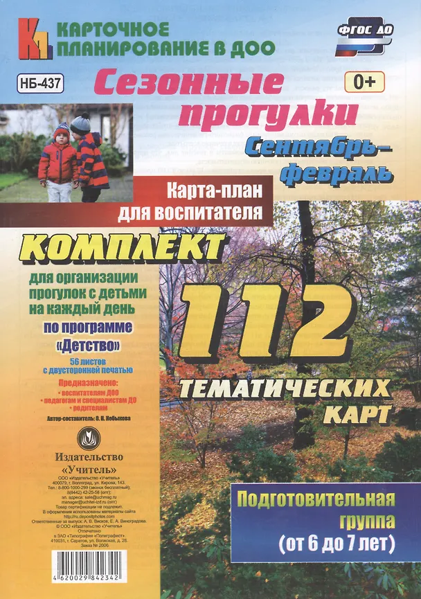 В комплекте из 112 тематических карт (56 листов с двусторонней печатью) представлена система прогулок, организуемых осенью и зимой в подготовительной группе, разработанная на основе положений ФГОС ДО, комплексной образовательной программы дошкольного образования "Детство" Т. И. Бабаевой, А. Г. Гогоберидзе, О. В. Солнцевой и др. (М.: Детство-Пресс).