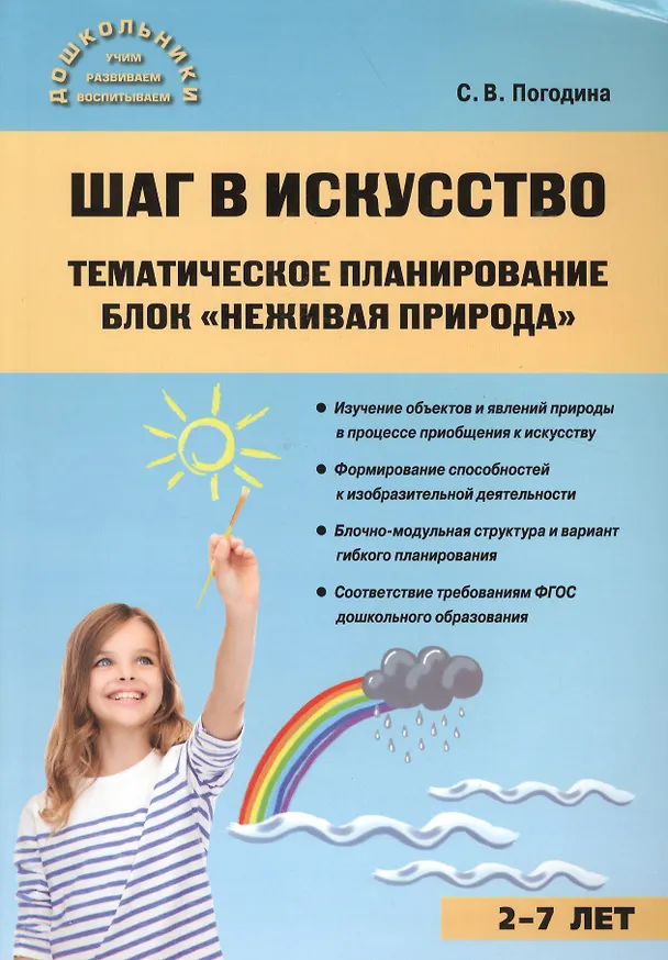 В пособии предлагается вариант планирования работы по темам блока “Неживая природа”, составной части оригинальной авторской программы “Шаг в искусство”, разработанной с целью художественно-эстетического развития детей дошкольного возраста, формирования у них способностей к изобразительной деятельности. Содержание этого блока предполагает изучение детьми основных стихий (вода, огонь, земля, воздух), их свойств, взаимодействия. Позволяет осуществлять творческое развитие детей по пяти направлениям: живописно-графическое, конструктивное, пластическое и декоративное творчество, знакомство с книжными иллюстрациями и произведениями искусства.