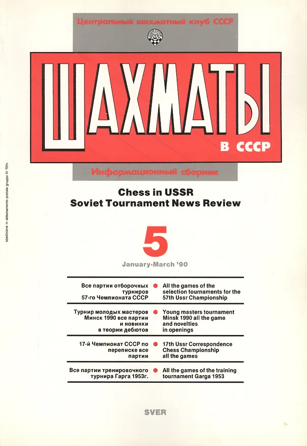 Ядро этого сборника, который предлагается вниманию читателя, составляют все 344 партий, сыгранных в отборочных соревнованиях 57-го чемпионата СССР. На этот раз отбор проходил по территориальному признаку, и полуфиналами явились чемпионаты Москвы, Российской Федерации и Украины. Для остальных республик и Ленинграда был проведен еще один полуфинальный турнир в Даугавпилсе (Латвия). Ему предшествовал отборочный турнир во Фрунзе (Киргизия), партии которого были опубликованы в предыдущем номере сборника (№ 4, 1989). Все полуфиналы прошли в конце 1989 года.