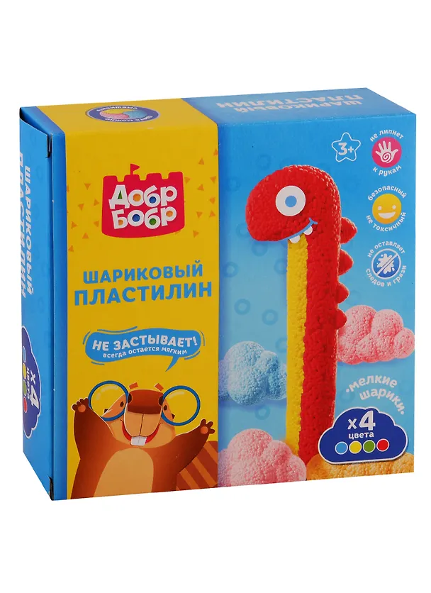 В наборе 4 цвета: красный, желтый, зеленый, синий. Мелкозернистый шариковый пластилин ДобрБобр очень легкий и пластичный материал, не высыхает на воздухе. Занятие лепкой развивают мелкую моторику рук. Шариковый пластилин - это необычная масса для лепки, состоящая из мельчайших пенопластовых шариков и связующего их вещества на основе глицерина. А так как этот вид пластилина рассчитан для детей от 3-х лет, то и производится он только из безопасных компонентов, которые не причинят вреда даже малышам, которые в силу возраста любят все тащить в рот. Шариковый пластилин очень легкий, воздушный и удобен тем, что совсем не прилипает к рукам. Но при этом он хорошо держит форму, скрывая все неровности