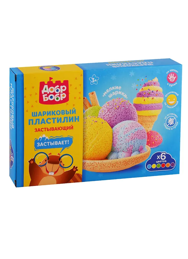 В наборе 6 цветов: красный, желтый, оранжевый, зеленый, синий, фиолетовый.Шариковый застывающий пластилин ДобрБобр - это пластилин, обладающий рядом удивительных свойств. Он прекрасно развивает мелкую моторику. Этот пластилин имеет очень приятные тактильные ощущения, прекрасно лепится. Так же большим преимуществом данного пластилина является то, что на воздухе пластилин ДобрБобр твердеет, благодаря чему с поделкой можно спокойно играть. Им можно разукрашивать картины, декорировать различные фигуры. После высыхания Шариковый пластилин становится легким и прочным. Благодаря всем его необычным свойствам, он по праву заслужил называться удивительным пластилином.