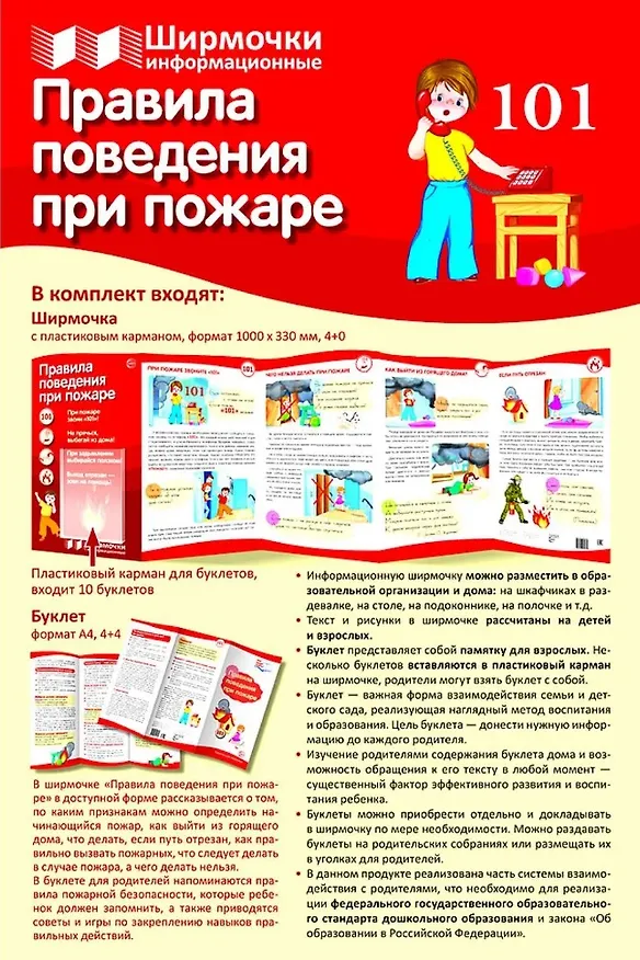 В ширмочке «Правила поведения при пожаре» в доступной форме рассказывается о том, по каким признакам можно определить начинающийся пожар, как выйти из горящего дома, что делать, если путь отрезан, как правильно вызвать пожарных, что следует делать в случае пожара, а чего делать нельзя.