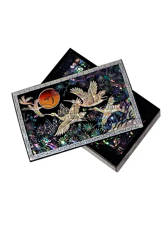 Шкатулка для украшений одноярусная с перламутром, покрыта лаком. Рисунок в виде летящих журавлей на фоне солнца. Такая шкатулка не оставят равнодушной ни одну любительницу изысканных вещей.