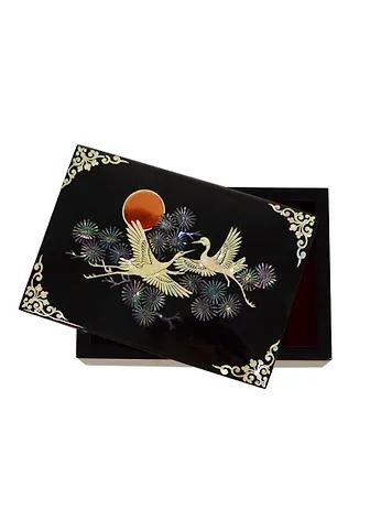 Шкатулка для украшений одноярусная с перламутром, покрыта лаком. Рисунок в виде двух летящих журавлей на фоне солнца. Такая шкатулка не оставят равнодушной ни одну любительницу изысканных вещей.