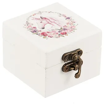 Шкатулка полностью белая, а её крышку украшает нежный единорог в окружении цветов. Внутри шкатулки есть небольшое зеркальце, глядя в которое удобно примерять украшения.