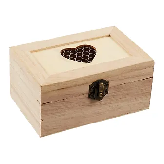 Шкатулка выполнена из светлого дерева, размер — 11,5 х 8 х 5,5 см. Она плотно закрывается на металлический замок с эффектом состарившейся бронзы. На крышке шкатулки вырезано сердечко, а во внутреннюю часть встроена сетка-подложка.