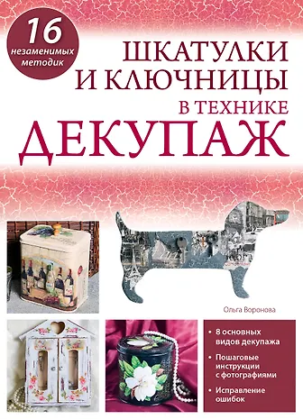 Шкатулки и ключницы в технике декупаж. Книгу купила, так как уважаю Ольгу Воронову и идеи ее мне нравятся. В книге автор объясняет технику классического и объемного декупажа, проводит работу над ошибками. Ну и предлагает несколько симпатичных идей с пошаговой техникой. Симпатичная книга, подходит даже для начинающих. И такие красивые подарки получаются!