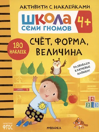 Книга «Счет, форма, величина 4+» из серии «Школа Семи Гномов. Активити с наклейками» предназначена для формирования и развития у детей от 4 до 5 лет элементарных математических представлений, способности измерять величину предметов, определять их форму.