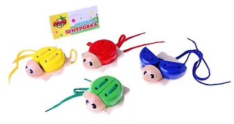 Оригинальная шнуровка в виде красочной божьей коровки и шнурок с деревянной иглой в форме червячка поможет Вашему малышу с интересом развивать моторику пальцев. Покажите ребенку, как червячок "ест" коровку : иголка-червячок заползает в одно отверстие, а затем выползает из другого.
