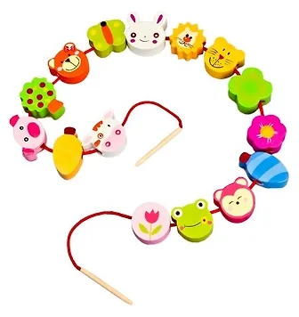 Эта простая, но интересная игрушка увлечет малыша! Цель игры - нанизать на шнурок все бусинки. Ребенку будет интересно каждый раз менять последовательность фигурок. К обоим концам шнурка прикреплены удобные деревянные "иголки", с помощью которых легко продеть шнурок в отверстие бусины.