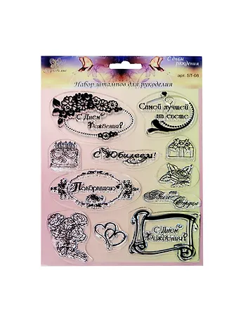Набор прозрачных штампов из термопластичной резины для нанесения печатей. Держатель и штемпельная подушка не входят в комплект. Применяется для оформления открыток, альбомов, в скрапбукинге, декупаже, мыловарении, для детского творчества и других видах рукоделия. Инструкция на русском языке.