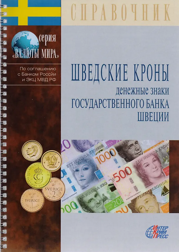 Профессиональный справочник, состоящий из двух разделов и содержащий экспертное описание банкнот и монет Государственного банка Швеции, находящихся в обращении, а также информацию о банкнотах ранних выпусков, выведенных из обращения или аннулированных.