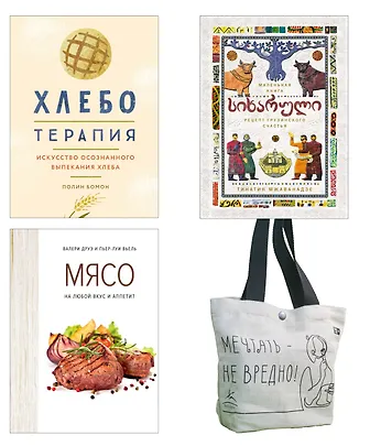 Это безумно переоценённый набор. По цене книги по отдельности многократно дешевле брать. Особенно в данной подборке выделяется книга про Хлеб, которая по сути своей является своеобразной книгой по саморазвитию, как ни странно, и читать некоторые моменты в ней даже смешно. Книга про мяса оказалась довольно неплохим сборником рецептов, а про грузинское счастье - как будто напечатанные вырезки из блога с рецептами.