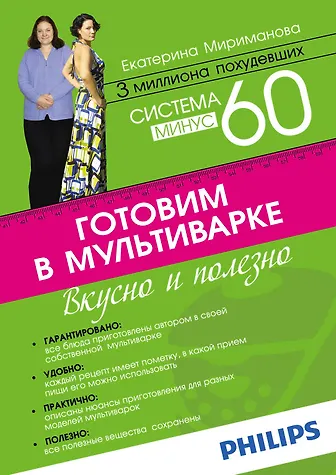Система минус 60 Готовим в мультиварке Вкусно и полезно. По- моему, началось выкачивание денег из читателя. Один за другим диетологи начали адаптировать свои системы под приготовление в мультиварке. Система Екатерины Миримановой мне очень нравится. я стараюсь ей следовать, и естественно, книгу купила, тем более. что она не дорого стоит. Но эти рецепты не существенно отличаются от книги ее обычных рецептов- опытная хозяйка вполне сама может подстроить любой рецепт под свою мультю. Поэтому книга полезная, но не обязательная.