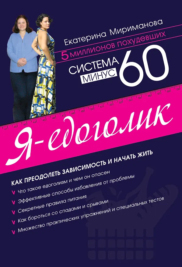 Что это за книга. Долгожданная новинка от Екатерины Миримановой, создателя системы «Минус 60», посвящена проблеме «едоголизма» – зависимости от еды, которой страдает, на самом деле, огромное количество людей. Уже много лет помогая людям с помощью своих книг, колонок, семинаров найти путь к стройной фигуре и новой жизни, Екатерина обратила внимание, что у многих худеющих сходные проблемы, при этом имеющие отношение далеко не только к тому, что и как они едят. В этой книге Екатерина обобщила свой опыт преодоления едоголизма и опыт помощи тысячам едоголиков, свела все принципы и ноу-хау в стройную систему и предлагает воспользоваться ей, чтобы наконец-то шагнуть в новую жизнь, свободную от зави