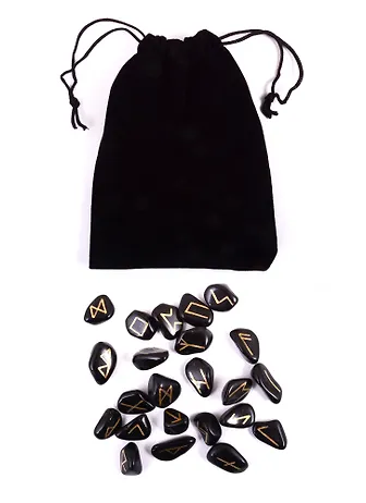 Набор рун из черного обсидиана включает в себя 25 рун с ручной гравировкой, на которые нанесена бронзовая краска, и мешочек из бархата – для удобства и сохранения энергетики набора.