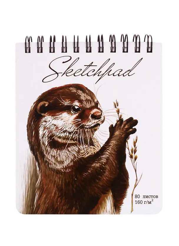 Небольшой скетчбук с милой выдрой на обложке. Держу этот блокнот всегда под рукой для быстрых зарисовок карандашами "на бегу". Для этого размер оптимальный. Достаточная площадь листа, а уголки скругленные. Передняя обложка и задняя подложка из очень толстого картона. Большая пружина. Внутренний блок из плотных альбомных листов молочного цвета.