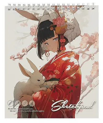 Мне понравился рисунок на обложке, но печать оказалась не самой качественной – цвета блёклые, смотрится как-то уныло, как старая выцветшая фотокарточка. Возможно, конечно, что так и задумано, но мне не понравилось. Сама обложка тонкая, уголки заминаются ещё до начала эксплуатации. Но качество гребня и бумаги приемлемое, работать можно, если главное именно это. Листы не застревают, не сминаются, не выпадают. Плотность бумаги соответствует заявленной, подходит для набросков, и размер позволяет носить с собой, скетчбук лёгкий и не занимает много места.