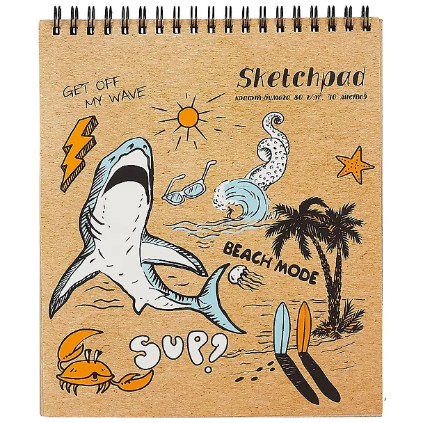 Супер скетчбук с крутым морским принтом на обложке, очень интересная летняя атмосфера, мне очень понравилось оформление. Листочки у скетчбука не белые, мне это показалось необычным, я на таких никогда не рисую, но мне нравится, рисунки выглядят по другому. Качество хорошее, спираль отлично держит, в конце удобная подложка, что позволяет рисовать без дополнительной опоры.
